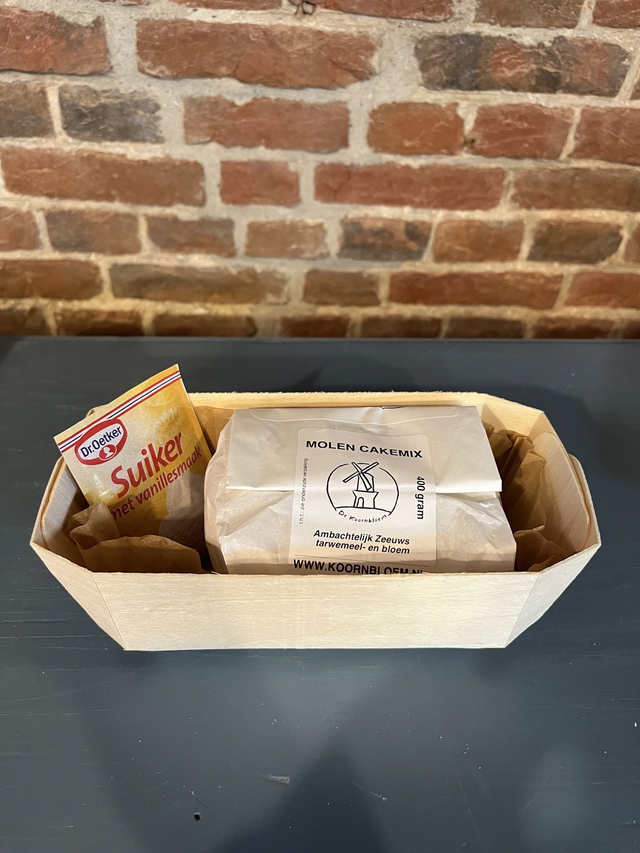 De molen cakemix is een heerlijke cake als basis. De inhoud is precies op de houtenbakvorm afgemeten en kan met de bakvorm in de oven! Leuk om als kado te geven of zelf thuis te bakken. De cakemix is 400 gram.