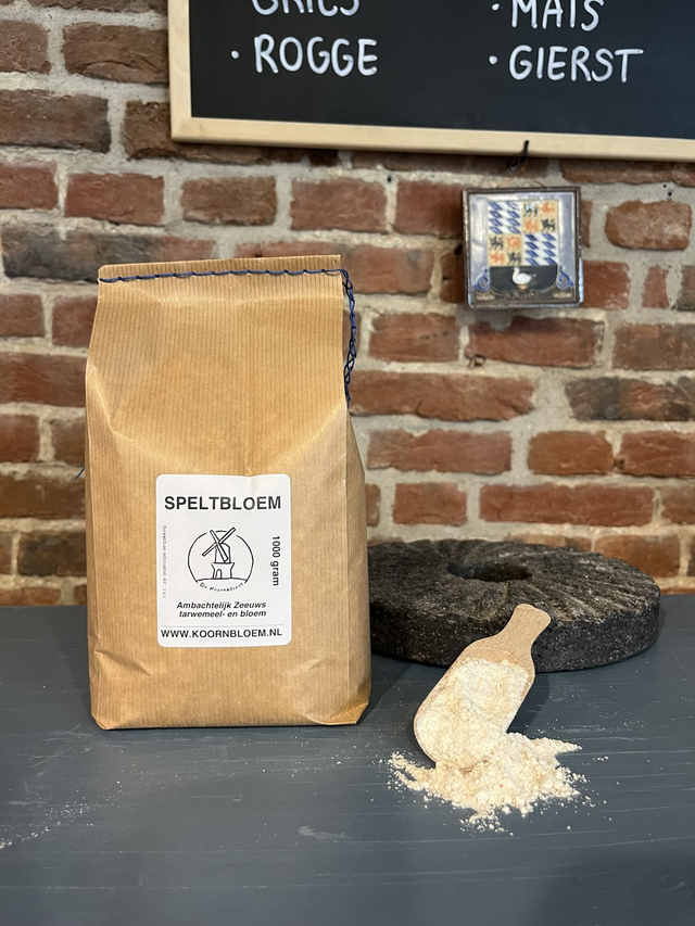 Speltbloem is gemaakt van speltgraan. Het speltmeel is gezeefd en daar houd je dan speltbloem van over.